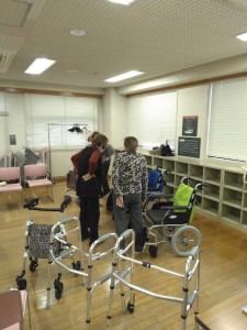 どの福祉用具も皆さま興味津々で、実際に歩行器を押してみたり、車椅子に乗ってみたり
