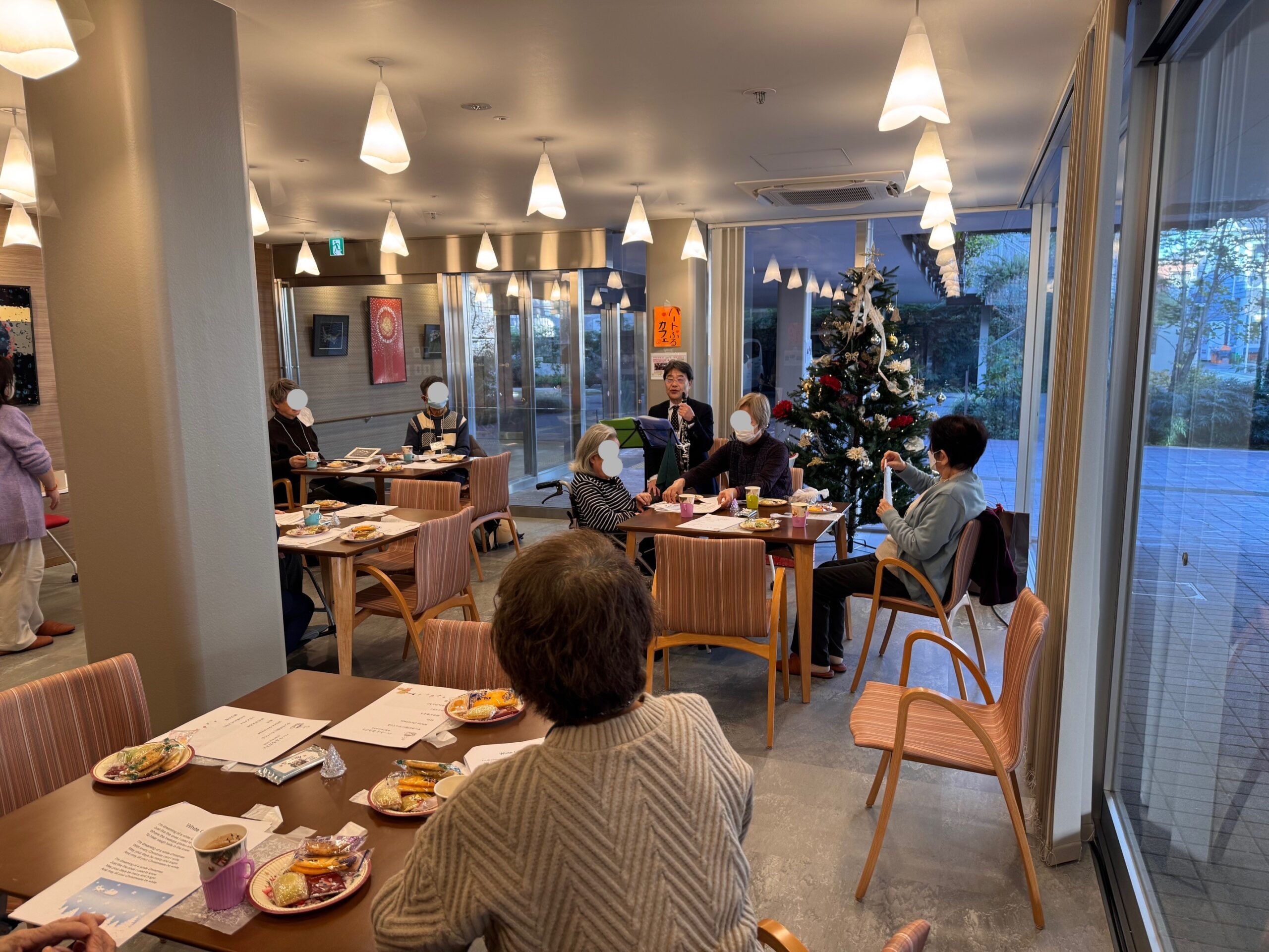 大きなクリスマスツリーが飾られた部屋で、クラリネットの柔らかい音色の演奏を聞いたり、演奏に合わせてクリスマスソングを歌ったりしました。幼稚園生の可愛い男の子も即興で「きらきら星」を演奏してくれました。スタッフの方からのクリスマスプレゼントを選ぶときは、みなさまニコニコしながらも真剣な顔で選んでいらっしゃいました。
