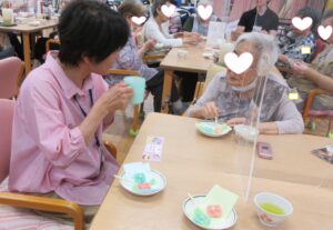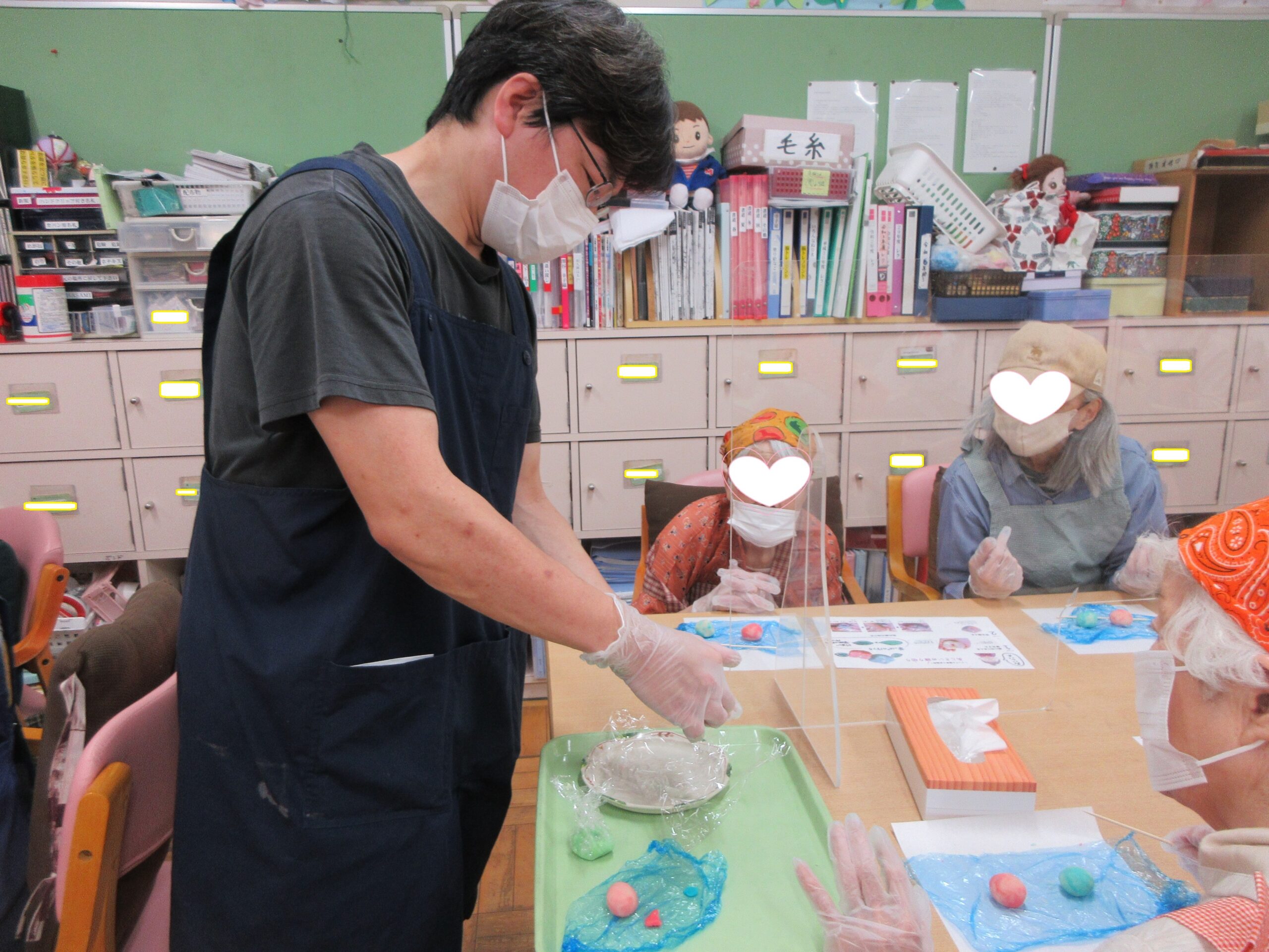 とっても真剣な眼差しで、こねて成型していく利用者さん。 出来上がった「紫陽花」は、3時においしいお茶と共にご自分のおやつとして召し上がってもらいました。