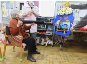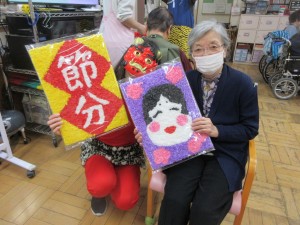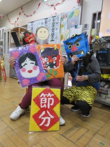 大きな鬼の口に布でできた恵方巻を投げ入れるゲームをしました。