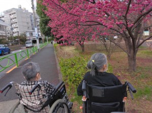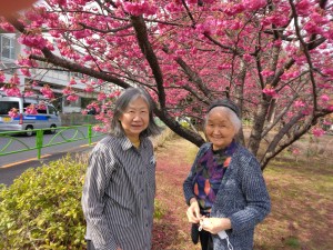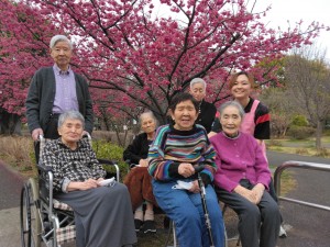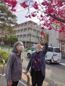 今日はとっても温かい日だったので ちょっとだけ【お花見】気分を味わいました。 濃いピンクの花びらが・・ とっても可愛かったです。 久しぶりのお散歩に 皆、笑顔でした。 後2週間もすれば、今度は桜のお花見本番です。