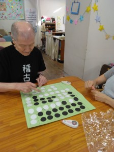 今日は職員手作りの『オセロゲーム』を やりました。 今日挑戦したのはデイホーム三宿の無口な紳士 黒に返せるところを・・・ よく考えながら・・・ 楽しそうにやっていました。