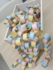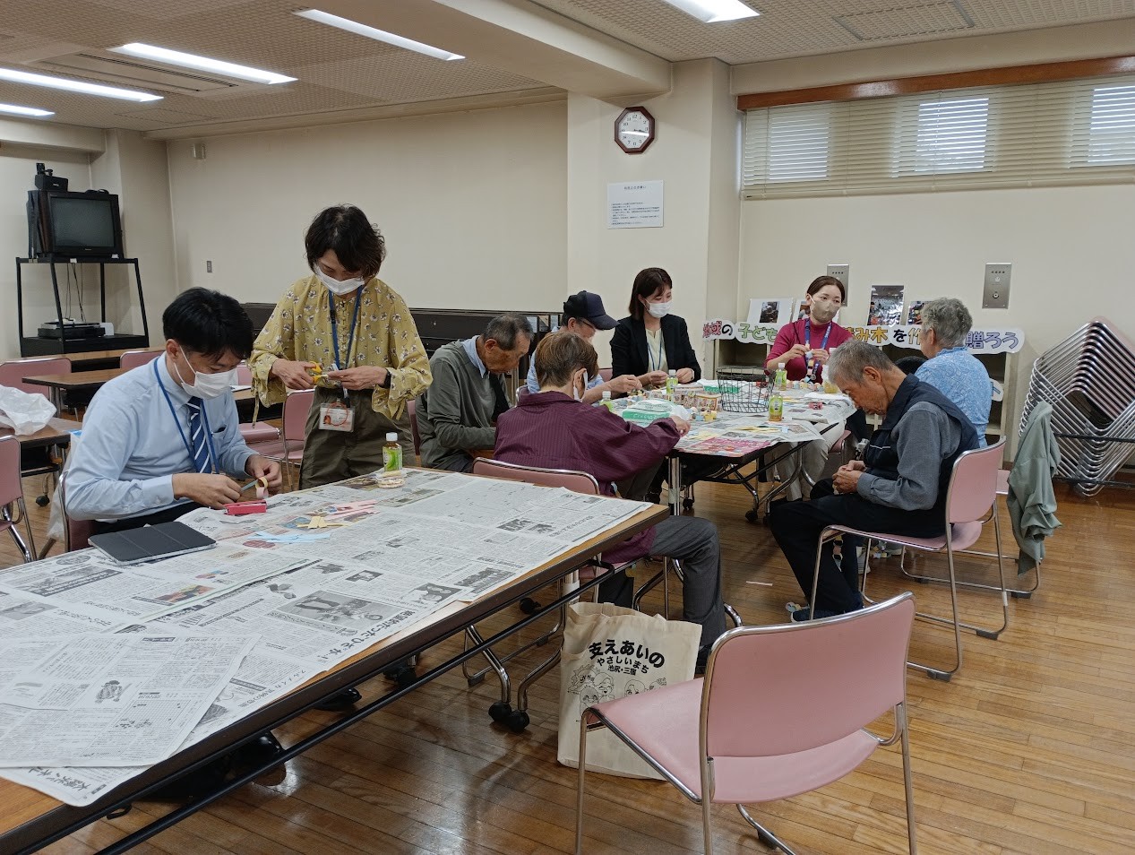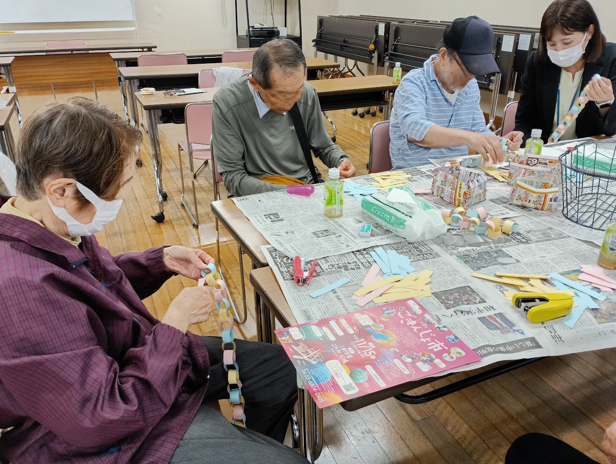 10月のにんにん会は7名の参加者にお集まりいただきました。この日は保育園に プレゼントする積み木の消毒や、11月15日開催予定の「ごきんじょ市」で出店する 「積み木プロジェクト」の飾り作りをしました。可愛い輪飾りが出来上がりました!