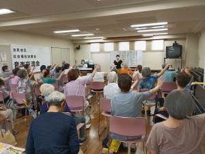 9月12日金曜日、約40名の地域の方がご参加しました。2か月ぶりの開催に会場の皆さんのワクワクぶりが伝わってきました。昔懐かしい曲「故郷の空」から始まり、「銀座カンカン娘」、「われは海の子」~と続き、途中、音楽脳トレを交えて~、1時間45分の交流会は瞬く間に終わりました(^_-)-☆