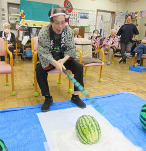 地域の方の和太鼓や歌に合わせて盆踊りをしたり、池尻小学校の子どもたちと一緒に西瓜割りをしたり、様々な催し物で大賑わい。利用者様も童心に戻り、笑顔が一味もふた味も違います。